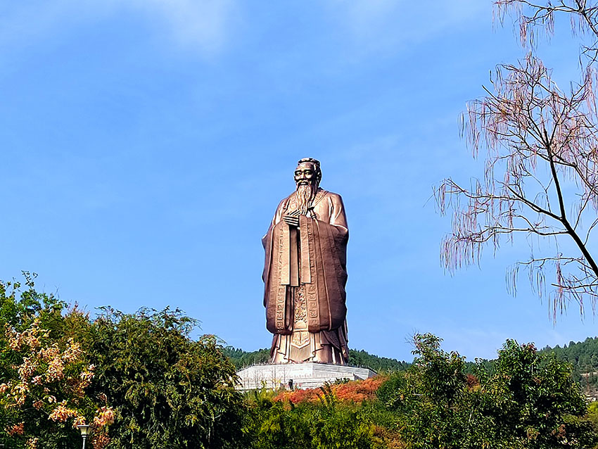 我們第一站就到了尼山圣境。尼山圣境位于山東省曲阜市東南25公里處的尼山下,背靠尼山,面朝尼山水庫,風景絕美。尼山是中國先哲孔子的誕生地。在尼山圣境景區,我對高聳入云的孔子像印象極深,據說像高72米,全用紫銅塑成,是世界上最大最高的孔子像,親臨其境仰望,我不只看到了“萬世師表”四個大字,還聞到了錢的味道。不過我對塑像的外觀還是比較滿意的,聽說是按照吳道子繪制的孔夫子像為藍本設計的,“可親、可敬,師者、長者、尊者”。